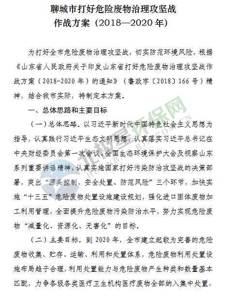 日前,山東省聊城市印發(fā)《聊城市打好危險廢物治理攻堅戰(zhàn)作戰(zhàn)方案(2018—2020年)》,詳情如下: