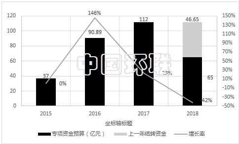 2017年中央財政預算土壤污染防治專項資金達到112億元,2018年預算數(shù)為65億元,實際預算為111.65億元,基本與同期持平。