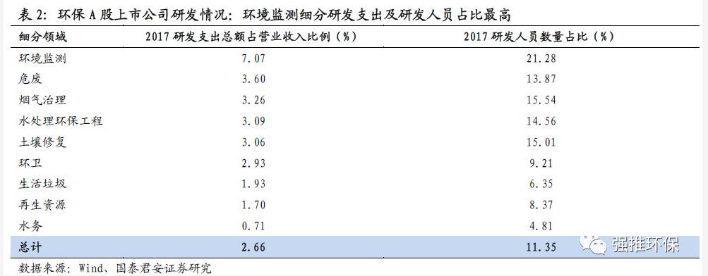 研發(fā)支出:研發(fā)支出收入占比、研發(fā)人員占比高。參考A股環(huán)保上市公司2017年平均研發(fā)支出總額占營業(yè)收入比例2.66%,研發(fā)人員數(shù)量占比11.35%,其中環(huán)境監(jiān)測細(xì)分研發(fā)支出及研發(fā)人員占比最高。