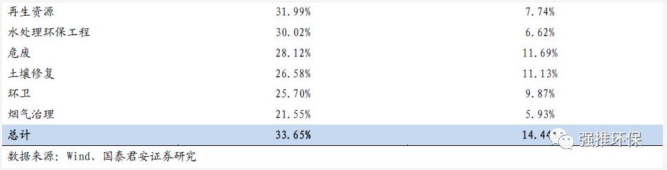 凈利潤率方面,危廢最高,固廢資源利用最低;危廢、固廢處置、聲環(huán)境治理、環(huán)衛(wèi)、大氣治理、節(jié)能、固廢資源利用分別為19%、17%、14%、13%、8%、0.1%、-3%。