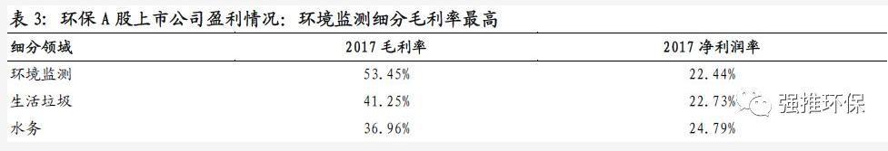 盈利水平:毛利率、凈利潤率高。參考A股環(huán)保上市公司2017年平均毛利率33.65%,凈利潤率14.44%,環(huán)境監(jiān)測細(xì)分盈利能力相對最強(qiáng)。