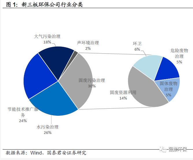 102家新三板掛牌環(huán)保公司中,從事固廢、水、節(jié)能、大氣治理業(yè)務(wù)數(shù)量比例分別為30%、26%、24%、18%。在萬德分類的新三板102家環(huán)保公司中,參考掛牌公司管理型行業(yè)分類及各公司主業(yè),除去6家主業(yè)為其他領(lǐng)域(光伏、工業(yè)二氧化碳制造等)公司后,剩余96家公司中,①從事固廢污染治理的公司29家(其中資源回收13家、環(huán)衛(wèi)6家、危廢5家、固廢處置5家);②從事水污染治理的公司25家;③從事節(jié)能服務(wù)的公司23家(工業(yè)及建筑節(jié)能等);④從事大氣污染治理的公司17家;⑤從事聲環(huán)境治理的公司2家。從公司數(shù)量占比來看,固廢、水、節(jié)能、大氣、聲環(huán)境治理公司數(shù)量占比分別為30%、26%、24%、18%、2%。