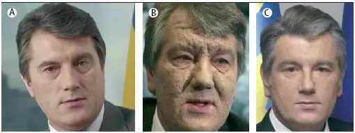 圖2 烏克蘭前總統(tǒng)尤先科中毒前(A)、中毒3個(gè)月(B)和中毒后3-5年(C)