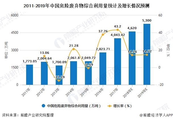 2019-2020年,清廢行動(dòng)逐漸向全國擴(kuò)散,有利于推動(dòng)危廢處理行業(yè)市場擴(kuò)大,前瞻初步估計(jì)我國危險(xiǎn)廢棄物綜合利用量為5300萬噸,預(yù)計(jì)2020年,我國危廢綜合利用量將呈現(xiàn)快速增長。