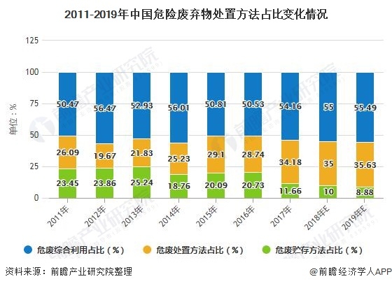隨著環(huán)保行業(yè)的發(fā)展,我國危險(xiǎn)廢棄物處置中綜合利用比重越來越高,由2011年的50.47%溫和上升到2017年的54.16%,前瞻初步估計(jì)2019年,危廢綜合利用占比將達(dá)到55.49%,深度資源化正成為危廢行業(yè)的發(fā)展方向;2015以來危廢貯存占比逐年下降,初步估計(jì)2019年危廢貯存量占比為8.88%;危廢處置占比也呈現(xiàn)增長態(tài)勢,初步估計(jì)2019年危廢處置方法占比達(dá)到35.63%。