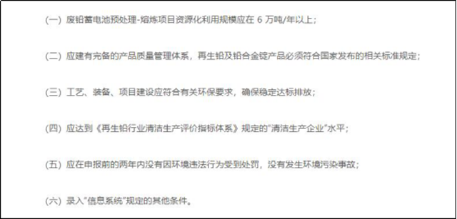 關(guān)于蓄電池的資源利用,《征求意見稿》提出了園區(qū)化管理和企業(yè)管理兩種。其中規(guī)定廢鉛蓄電池資源化利用項(xiàng)目應(yīng)位于功能定位相符、環(huán)保基礎(chǔ)設(shè)施齊全的產(chǎn)業(yè)園區(qū)內(nèi);各地市應(yīng)提出轄區(qū)內(nèi)符合條件的規(guī)范資源化利用企業(yè),經(jīng)行業(yè)評(píng)議、部委合議后錄入“信息系統(tǒng)”,具體條件如下: