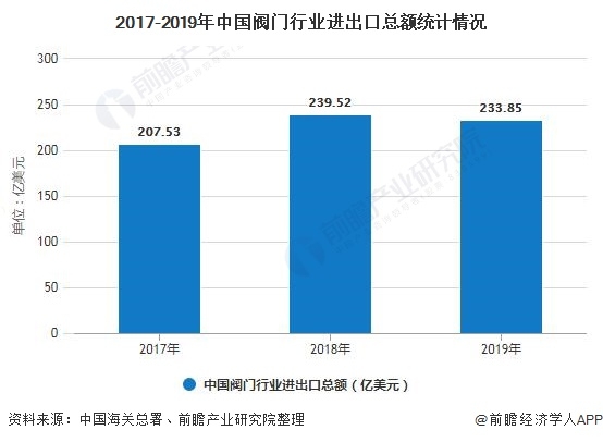 在我國目前的閥門市場上,除了低壓閥門已經(jīng)達(dá)到國際市場能接受的水平外,高壓閥門仍然要依靠進(jìn)口。在宏觀經(jīng)濟(jì)下行,國際貿(mào)易形式不明朗的情形下,行業(yè)進(jìn)出口數(shù)額有較大的波動,2018年,行業(yè)實(shí)現(xiàn)進(jìn)出口總額239.52億美元,2019年進(jìn)出口總額略微下滑,為233.85億美元,同比下滑2.37%。