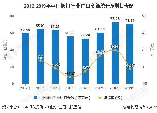 從進(jìn)口金額的角度看,2018年閥門進(jìn)口金額達(dá)到73.28億美元,同比增長19.95%;2019年進(jìn)口金額為71.54億美元,同比下滑2.37%。