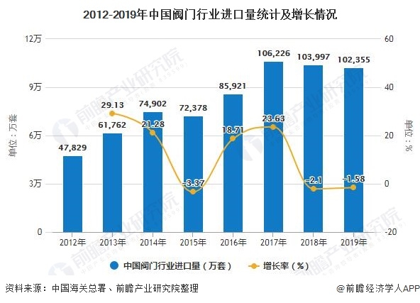 海關(guān)數(shù)據(jù)顯示,2012-2019年,我國閥門行業(yè)進(jìn)口量總體呈波動上升趨勢。2018-2019年這兩年由于受到與美國的貿(mào)易摩擦影響,行業(yè)進(jìn)口量和增速均下滑,2019年行業(yè)進(jìn)口量為102355萬套,同比下滑1.58%。