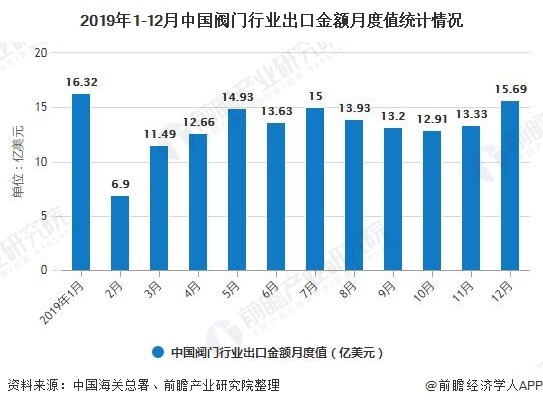 2019年1-12月,我國閥門行業(yè)出口金額波動較大,其中2019年1月實(shí)現(xiàn)最大出口金額,為16.32億美元;2019年2月出口金融最低,為6.9億美元。