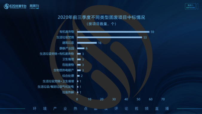 將固廢項目按照項目類型細分,其中:有機廢棄物處置項目59個,生活垃圾焚燒項目53個,建筑垃圾處置項目16個,靜脈產業(yè)園建設與運營項目6個,生活垃圾焚燒與有機廢棄物協(xié)同、衛(wèi)生填埋、危險廢物處置、生物質熱電聯(lián)產等項目各3個,生活垃圾綜合處理項目2個,生活垃圾焚燒與衛(wèi)生填埋協(xié)同、垃圾熱解、生活/餐廚垃圾氣化發(fā)電項目各1個。