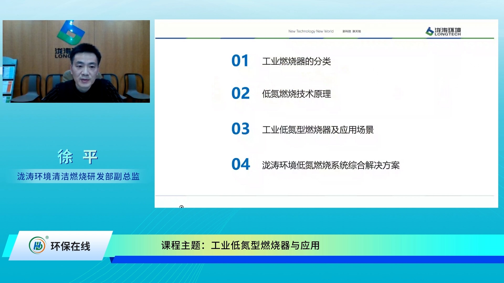 課程中,深耕環(huán)保行業(yè)尤其是清潔燃燒領域多年的徐平老師從“工業(yè)燃燒器的分類”“低氮燃燒技術原理”“工業(yè)低氮型燃燒及應用”“瀧濤環(huán)境低氮燃燒系統(tǒng)綜合解決方案”4大部分進行了分享解讀,滿滿都是干貨。