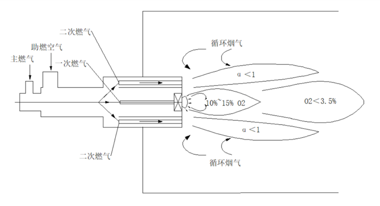 以低氮型調焰燃燒器為例,其利用空氣分級和燃氣分級原理,將燃料和空氣分配供給噴射單元,使火焰長度加長,更適合爐型較寬場合;可以通過調節(jié)一次氣和二次氣分配比例,調節(jié)火焰長短;利用濃淡燃燒原理,分配不同當量比的空氣與燃氣,使局部燃燒空間的燃料受到抑制,從而降低NOx排放。
