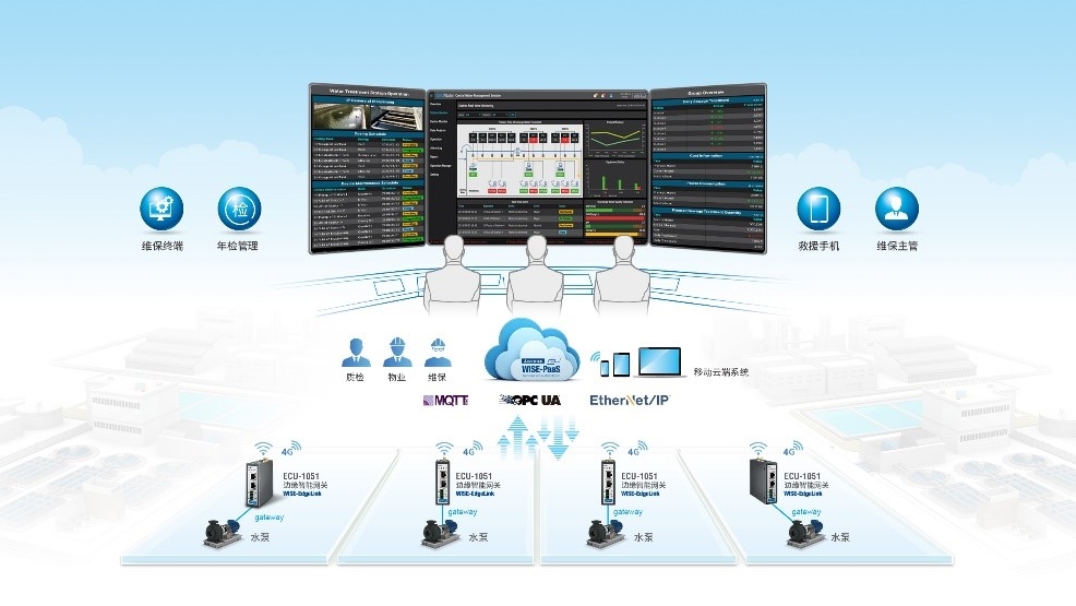 當(dāng)前很多的泵站監(jiān)控仍以人工方式進(jìn)行現(xiàn)場(chǎng)啟停,誤操作/延遲操作等情況時(shí)有發(fā)生,導(dǎo)致監(jiān)測(cè)不精準(zhǔn),監(jiān)管不到位,事故頻發(fā)。研華ECU-1051系列智能網(wǎng)關(guān)支持多種型號(hào)的PLC控制器的數(shù)據(jù)采集,并可以通過(guò)MQTT協(xié)議直接對(duì)接運(yùn)營(yíng)商所選的云平臺(tái)Webaccess為BS架構(gòu)組態(tài)軟件,有效采集、展示、分析數(shù)據(jù)。通過(guò)遠(yuǎn)程控制方式對(duì)于現(xiàn)場(chǎng)設(shè)備進(jìn)行實(shí)時(shí)、準(zhǔn)確的監(jiān)測(cè)及故障預(yù)警,遠(yuǎn)程分級(jí)監(jiān)控管理設(shè)備狀況,實(shí)現(xiàn)設(shè)備、人、數(shù)據(jù)、流程的互聯(lián)互通,無(wú)縫對(duì)接企業(yè)ERP/CRM/手機(jī)APP系統(tǒng)遠(yuǎn)程資產(chǎn)管理設(shè)備位置信息建立產(chǎn)品知識(shí)庫(kù),優(yōu)化產(chǎn)品性能及供應(yīng)鏈管理,提高產(chǎn)品競(jìng)爭(zhēng)力。