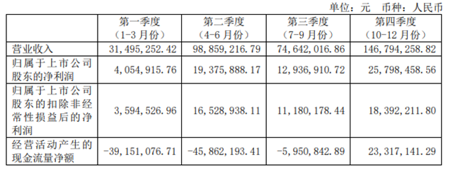 綜合分季度主要財務(wù)數(shù)據(jù)(圖2)來看,第一季度較為穩(wěn)定,收入是3149.5萬元;第二季度收入逐漸樂觀,達(dá)到了9885.9萬元;第三季度有些許下降,收入為7464.2萬元;第四季度收入明顯增長,達(dá)到了1.47億元,且凈利潤和現(xiàn)金流動凈額都有大幅的增長。