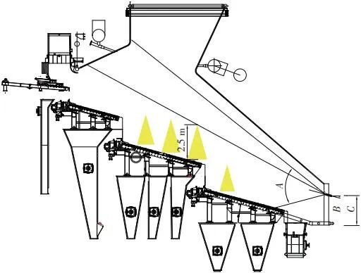 當(dāng)前生活垃圾焚燒爐廣泛采用的爐膛火焰監(jiān)視系統(tǒng)基本上都是由早期應(yīng)用在水泥廠、鋼鐵廠的加熱爐、退火爐和氧化鋁廠等行業(yè)內(nèi)的高溫看火工業(yè)電視演變升級(jí)而來(lái)。內(nèi)窺式數(shù)字高清爐膛火焰監(jiān)視系統(tǒng)成像裝置主要由耐高溫針孔電動(dòng)鏡頭、寶石物鏡、光學(xué)濾光片、光圈焦距調(diào)節(jié)器等組成,配有電控推進(jìn)器、氣源控制柜、光端機(jī)等輔助設(shè)備。其核心問(wèn)題是如何在生活垃圾焚燒爐的高溫、多塵、強(qiáng)腐蝕環(huán)境中長(zhǎng)周期穩(wěn)定運(yùn)行,保證火焰畫面不丟包、不失真。1)優(yōu)勢(shì)特性分析。一是技術(shù)成熟、運(yùn)行穩(wěn)定。隨著我國(guó)近一二十年間生活垃圾發(fā)電廠的興建,爐膛火焰監(jiān)視系統(tǒng)的技術(shù)也處于不停地優(yōu)化和迭代之中,目前已能滿足穩(wěn)定、可靠的要求。其中常規(guī)配置參數(shù)為攝像頭300 萬(wàn)像素,響應(yīng)時(shí)間2 s,光圈(F數(shù))1.6,焦距2.4 mm。二是工作環(huán)境好。爐膛火焰監(jiān)視器探頭通常安裝于焚燒爐后墻,所處位置是垃圾燃燒最末端,常規(guī)工況下探頭周圍煙氣溫度通常<600 ℃。較之焚燒爐其他高溫環(huán)境已算“宜居地帶”。三是維護(hù)量小。焚燒爐后墻幾乎沒有結(jié)焦現(xiàn)象,常規(guī)爐膛火焰監(jiān)視探頭開孔位置僅存有因爐膛偶爾正壓時(shí)煙氣外冒造成的積灰,積灰量不大,清理工作較為輕松。2)劣勢(shì)特性分析。一是參數(shù)單一。因垃圾焚燒行業(yè)爐型構(gòu)造和燃燒成分的特殊性,垃圾焚燒爐長(zhǎng)期采用的火焰探頭利用的是光學(xué)成像原理,運(yùn)行人員僅能通過(guò)觀察火焰形狀和位置來(lái)判斷焚燒爐工況,無(wú)法得到多維度參數(shù)。二是視角局限。爐膛火焰探頭通常位于焚燒爐后墻,安裝角度朝向爐內(nèi)成斜向上方向,與水平線夾角15°左右,探頭視場(chǎng)角通常>60°。以某大型列動(dòng)順推爐排焚燒爐為例,在此仰視角度下可以看到爐排燃燒段尾部、燃燼段前部?jī)擅婷黠@的火焰幕墻,由于火焰鋒面遮擋,很難觀察到燃燒段中前部的火焰狀況。 以某單臺(tái)750 t/d大型列動(dòng)順推爐排焚燒爐中爐膛火焰監(jiān)視器安裝位置和顯示畫面為實(shí)例,具體分析火焰成像狀態(tài)。其實(shí)際火焰成像畫面見圖1。成像角度是由焚燒爐后墻探頭位置向上仰視爐膛。因焚燒工況十分良好,靠近后墻的燃燼段區(qū)域幾乎沒有明火,燃燒段尾部成一面豎直、光亮的黃紅色火焰鋒面,高度約為2.5 m。對(duì)應(yīng)的爐膛火焰監(jiān)視器安裝示意如圖2所示。爐膛火焰探頭安裝在焚燒爐后墻,安裝位置與后墻觀火平臺(tái)地面距離為C(m)。開孔傾角與水平方向夾角為B(°),有效視場(chǎng)角為A(°)。圖2中由黃色填充的三角形區(qū)域代表正常燃燒火焰,其中標(biāo)注高度2.5 m的區(qū)域?yàn)槿紵隣t排尾部火焰,即為圖1所顯示的火焰鋒面。顯然,從爐膛火焰監(jiān)視器向上望去,燃燒段前部、中部火焰為視野盲區(qū)。由于被燃燒段尾部火焰鋒面遮擋,通過(guò)火焰監(jiān)視器通常只能看到燃燒段尾部、燃燼段前部這兩個(gè)區(qū)域的火焰。