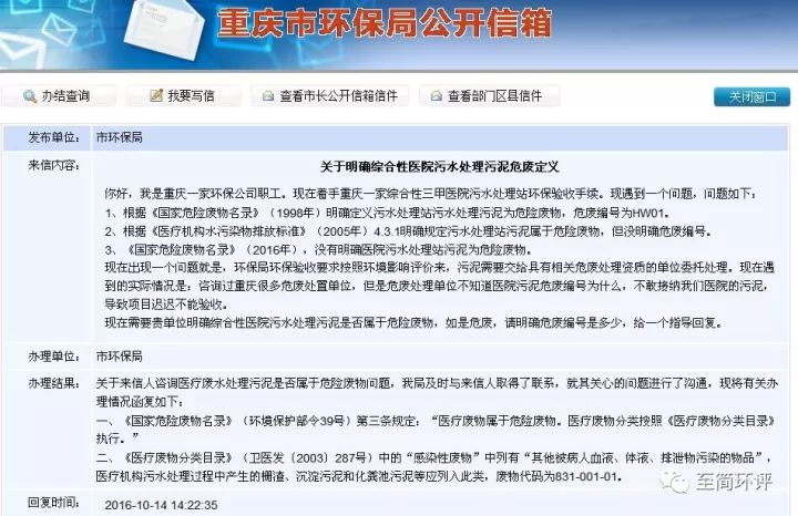 關(guān)于來(lái)信人咨詢醫(yī)療廢水處理污泥是否屬于危險(xiǎn)廢物問(wèn)題,我局及時(shí)與來(lái)信人取得了聯(lián)系,就其關(guān)心的問(wèn)題進(jìn)行了溝通,現(xiàn)將有關(guān)辦理情況函復(fù)如下: