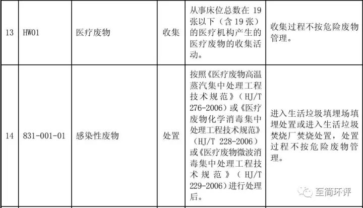 根據(jù)上文中將醫(yī)療廢水污泥歸類于醫(yī)療廢物中的“感染性廢物”(831-001-01),結(jié)合上表,豁免情況就很明朗了。即19張(含)床位數(shù)以下的醫(yī)療機(jī)構(gòu)產(chǎn)生的醫(yī)療廢物的收集活動(dòng),包括污泥,收集過(guò)程不按危險(xiǎn)廢物管理;另外,感染性廢物,當(dāng)然包括污泥處置環(huán)節(jié)不按危險(xiǎn)廢物處理。