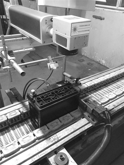 圖為鉛酸蓄電池生產(chǎn)基地,在全自動輸送帶上,激光打標(biāo)機(jī)給全自動輸送帶上經(jīng)過的一件件電池產(chǎn)品燙上專屬二維碼。