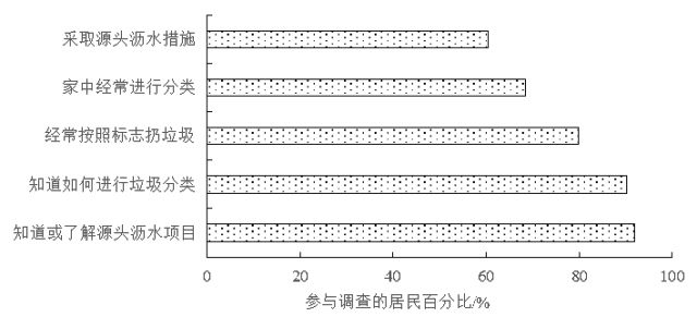 試點(diǎn)小區(qū)內(nèi)設(shè)立了生活垃圾分類督導(dǎo)員,負(fù)責(zé)日常宣傳和監(jiān)督工作。在環(huán)衛(wèi)處的協(xié)調(diào)下,組織居民到固體廢物處理終端和管理中心進(jìn)行現(xiàn)場(chǎng)參觀,普及生活垃圾常識(shí),提高參與積極性。問卷調(diào)查是了解居民對(duì)垃圾分類知曉率和參與程度的有效途徑,試點(diǎn)期間在試點(diǎn)小區(qū)發(fā)放調(diào)查問卷150份,收回有效問卷124份,主要結(jié)果列于圖2。調(diào)查顯示,盡管90%以上的居民了解生活垃圾源頭瀝水和分類收集的具體要求,但是僅有60%的居民能夠按照要求采取源頭瀝水并分類投放,居民長(zhǎng)期形成的生活習(xí)慣在短時(shí)間內(nèi)難以改變。廚余垃圾粉碎機(jī)的實(shí)際使用率約為90%,大部分居民對(duì)粉碎機(jī)的運(yùn)行效果比較滿意。綜合來(lái)看,試點(diǎn)小區(qū)約有60%的居民按要求源頭瀝水和分類投放廚余垃圾,10%的居民使用了廚余粉碎機(jī),其余30%的居民沒有真正參與。