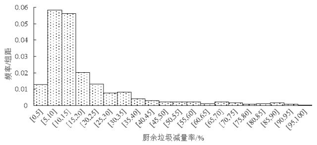 試點(diǎn)期間共收集小區(qū)居民反饋的廚余垃圾瀝水前后質(zhì)量數(shù)據(jù)4038條,瀝水前后的質(zhì)量差與瀝水前廚余垃圾質(zhì)量的比值即為廚余垃圾減量率。利用軟件IBM SPSS statistics 20進(jìn)行描述性統(tǒng)計(jì)分析,得到廚余垃圾減量率的頻率分布直方圖(圖3)。廚余垃圾減量率主要分布在5%~15%之間,平均值為18%,中位數(shù)為12%,其頻率分布為右偏分布(偏度,2.27>0)和尖峰分布(峰度,5.14>3)。由于極端值和稱量誤差的干擾,直接用平均值表示廚余垃圾減量率并不準(zhǔn)確,宜采用中位數(shù)表征。