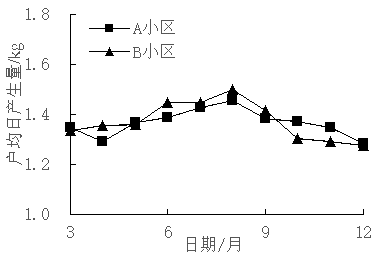 居民家庭的生活垃圾產(chǎn)生量與日常生活習(xí)慣和消費(fèi)支出有關(guān),試點(diǎn)小區(qū)居民戶均日產(chǎn)生量如圖4所示。試點(diǎn)小區(qū)10個(gè)月內(nèi)共收集生活垃圾177 t,戶均日產(chǎn)生量為1.37 kg,6~9月生活垃圾產(chǎn)生率較高。統(tǒng)計(jì)數(shù)據(jù)顯示,周末和節(jié)假日的居民區(qū)生活垃圾產(chǎn)生量比工作日高20%以上,生活垃圾產(chǎn)生率與在家停留時(shí)間成正相關(guān)性。