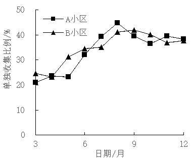 試點(diǎn)期間,兩小區(qū)共單獨(dú)收集廚余垃圾60 t,隨著宣傳引導(dǎo)工作的深入,單獨(dú)收集的廚余垃圾比例逐月升高(圖5),最終穩(wěn)定在40%以上。以廚余垃圾在生活垃圾中的比例為65%計(jì)算,按要求源頭瀝水并單獨(dú)投放廚余垃圾的居民比例約為62%,問卷調(diào)查顯示60%的居民能夠按照要求操作,與監(jiān)測(cè)結(jié)果基本吻合。