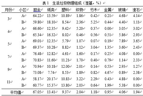 生活垃圾的物理組成與多種因素有關(guān),不同產(chǎn)生源的生活垃圾物理組成差異較大。表1列出了試點(diǎn)小區(qū)生活垃圾的物理組成,廚余垃圾的含量顯著高于其他成分,且5~9月的比例更高。四分類推廣過(guò)程中,有害垃圾的分類效果最好,可回收物分離效果最差。紙盒、塑料包裝和玻璃瓶混在生活垃圾中,被廚余垃圾污染,回收難度加大。試點(diǎn)初期居民將廚房垃圾與廚余垃圾混淆,用過(guò)的餐巾紙和食品外包裝等大量進(jìn)入廚余垃圾桶,三個(gè)月后,廚余垃圾桶內(nèi)廚余垃圾比例達(dá)到90%以上,滿足生物處理的需要。