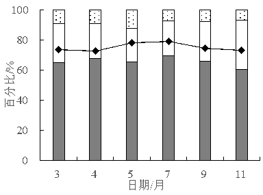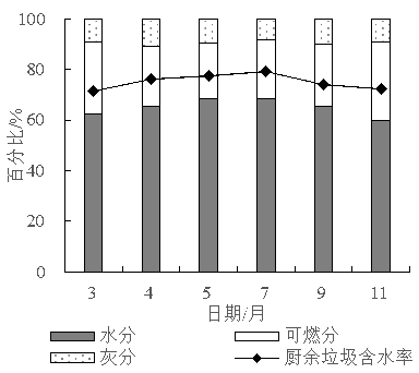 生活垃圾的三組分包括水分、可燃分和灰分(圖6),廚余垃圾平均含水率為75.24%,生活垃圾平均含水率為65.34%,且5~9月含水率最高。夏季水分含量較高的果蔬類廢棄物所占比例明顯高于其他季節(jié),導(dǎo)致廚余垃圾比例升高,含水率隨之升高。利用軟件IBM SPSS statistics 20對(duì)生活垃圾含水率和廚余垃圾含水率數(shù)據(jù)分別進(jìn)行W檢驗(yàn),在顯著性水平α=0.05條件下均滿足正態(tài)分布。二者Pearson相關(guān)系數(shù)為0.726,在0.01水平(雙側(cè))顯著相關(guān),降低生活垃圾含水率的關(guān)鍵在于降低廚余垃圾含水率。