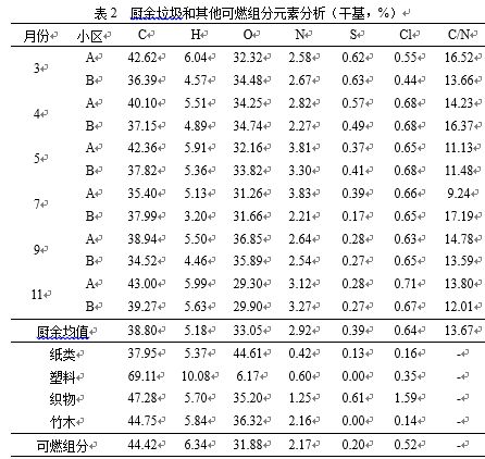 對(duì)廚余垃圾和其他可燃組分進(jìn)行元素分析(表2),廚余垃圾對(duì)可燃組分中N、S、Cl的貢獻(xiàn)率分別為67%、96%、62%,是填埋和焚燒處理時(shí)各種污染物的主要來(lái)源。食品消費(fèi)結(jié)構(gòu)影響廚余垃圾的元素組成,植物類殘?jiān)蕉?,C/N值越高。