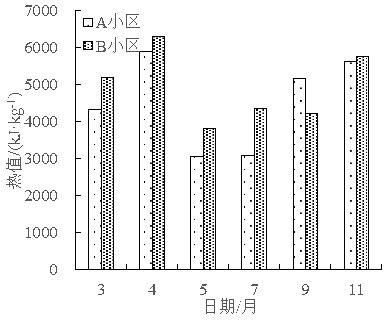 利用氧彈法測(cè)定熱值時(shí),將垃圾中的玻璃、金屬等惰性物質(zhì)的熱值忽略不計(jì)。氧彈法測(cè)出生活垃圾的干基高位熱值Q,利用《生活垃圾采樣和分析方法》(CJ/T 313-2009)推薦的熱值計(jì)算公式將其轉(zhuǎn)化為濕基低位熱值QL,其中Cw表示樣品含水率(%),H為干基氫元素含量(%),計(jì)算時(shí)均采用實(shí)測(cè)值,結(jié)果如圖7所示。