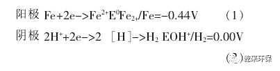 電極反應(yīng)產(chǎn)物具有高的化學(xué)活性,其中新生態(tài)的〔H〕和Fe2+能與廢水中的許多組分發(fā)生氧化還原作用,破壞廢水的發(fā)色或助色基團(tuán),失去發(fā)色能力;使大分子物質(zhì)分解為小分子物質(zhì)使難生物降解的物質(zhì)轉(zhuǎn)變成容易生物降解的物質(zhì),提高廢水的可生化性。在陰極,當(dāng)電解質(zhì)溶液(廢水)中有去極劑存在時,則有