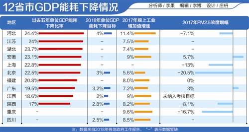 在12個(gè)省市中,有一半公布了2018年單位GDP能耗下降的目標(biāo)。其中河北以4%排在第一位,廣東、北京分別以3.2%、3%排在第二梯隊(duì),中西部地區(qū)的陜西、四川、江西分別以2.8%、2.5%、2%排在第三梯隊(duì)。