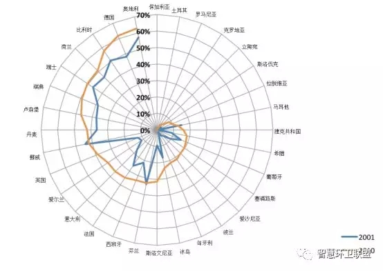 歐盟成員國會定期收集回收利用率的數據,因此擁有系統(tǒng)的數據記錄,但即便如此,成員國對回收利用的定義卻也仍然存在差異——一些國家將以回收利用為目的進行收集的比例當作回收利用率,一些國家則利用資源回收利用設施和堆肥設施的輸出作為計算的依據;一些國家將焚燒發(fā)電廠最后排出的金屬和集料算入了回收利用率,另一些則將這一部分排除在外。圖9展示了歐盟各成員國在2001年和2011年時的回收利用率,可以看出,隨著回收利用率較低的成員國向著歐盟目標的不斷努力,歐盟的總體回收利用率出現了十分明顯的提升。