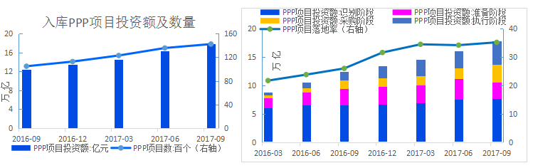截止到2017年9月30日,入庫項目14220個,總投資額17.8萬億元,進入執(zhí)行階段項目6778個,總投資額10.1萬億元,落地率為35.2%。
