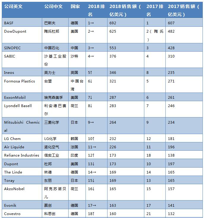 美國化學(xué)學(xué)會(huì)(AmericanChemicalSociety,ACS)旗下《化學(xué)與工程新聞》雜志(Chemical&EngineeringNews,C$EN)發(fā)布2018年度全球化工50強(qiáng)(C&EN’SGlobalTop50ChemicalCompanies)榜單,德國BASF公司連續(xù)12年雄踞榜首,美國DowDupont公司位居第二位,中石化集團(tuán)位列第三位。