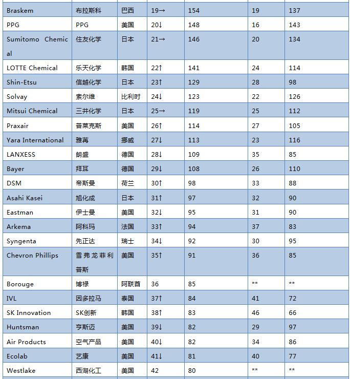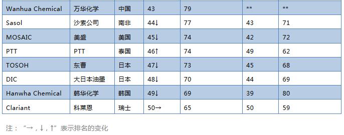 中國企業(yè)方面,除了中石化和臺(tái)塑以外,又有一家實(shí)力雄厚企業(yè)進(jìn)入榜單-萬華化學(xué),另外先正達(dá)已被中國化工收購,中國上榜企業(yè)達(dá)到4家和韓國齊平。