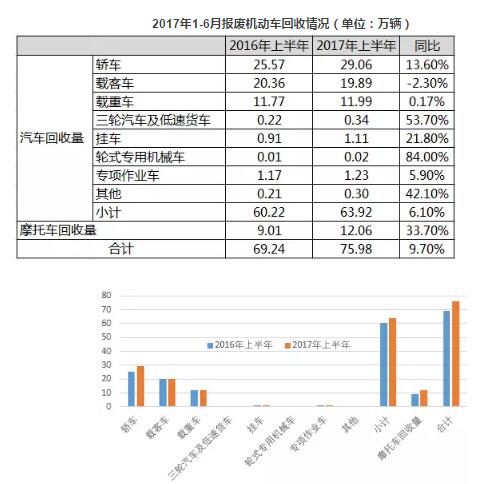 2017年上半年行業(yè)發(fā)展情況2017年上半年,我國回收拆解量較上年度同期有所上升。今年1-6月份,全國回收報廢機(jī)動車共計75.98萬輛,與2016年上半年的69.24萬輛相比,同比增長9.7%。數(shù)據(jù)來源:中國物資再生協(xié)會其中,回收報廢汽車63.92萬輛,同比增長6.1%;回收報廢摩托車12.06萬輛...