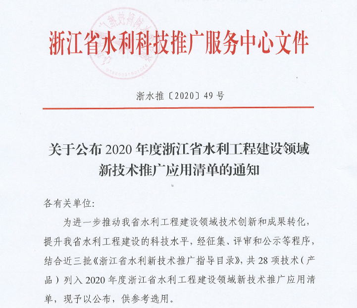 2020年11月26日,浙江省水利科技推廣服務(wù)中心公開發(fā)布《關(guān)于公布2020年度浙江省水利工程建設(shè)領(lǐng)域新技術(shù)推廣應(yīng)用清單的通知》。通知顯示: 為進一步推動浙江省水利工程建設(shè)領(lǐng)域技術(shù)創(chuàng)新和成果轉(zhuǎn)化,提升水利工程建設(shè)的科技水平,經(jīng)征集、評審和公示等程序,結(jié)合近三批《浙江省水利新技術(shù)推廣指導(dǎo)目錄》,由浙江...
