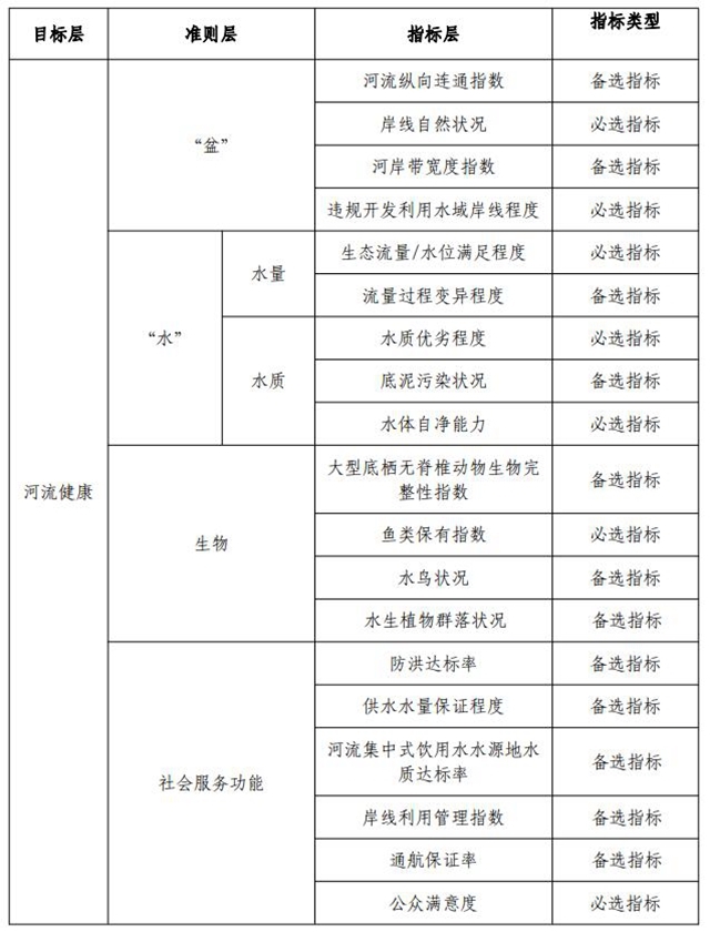 《指南》從生態(tài)系統(tǒng)結(jié)構(gòu)完整性、生態(tài)系統(tǒng)抗擾動彈性、社會服務功能可持續(xù)性三個方面建立河湖健康評價指標體系與評價方法,從“盆”、“水”、生物、社會服務功能等4個準則層對河湖健康狀態(tài)進行評價。