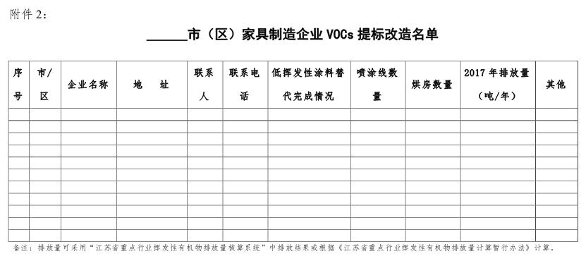 2018年底前,完成全市現(xiàn)有家具制造業(yè)企業(yè)VOCs提標(biāo)改造治理,提升我市家具制造行業(yè)的VOCs治理水平,全面按期達(dá)到《表面涂裝(家具制造業(yè))揮發(fā)性有機物排放標(biāo)準(zhǔn)》(DB32/3152-2016)(以下簡稱“標(biāo)準(zhǔn)”)要求,減少VOCs排放總量。